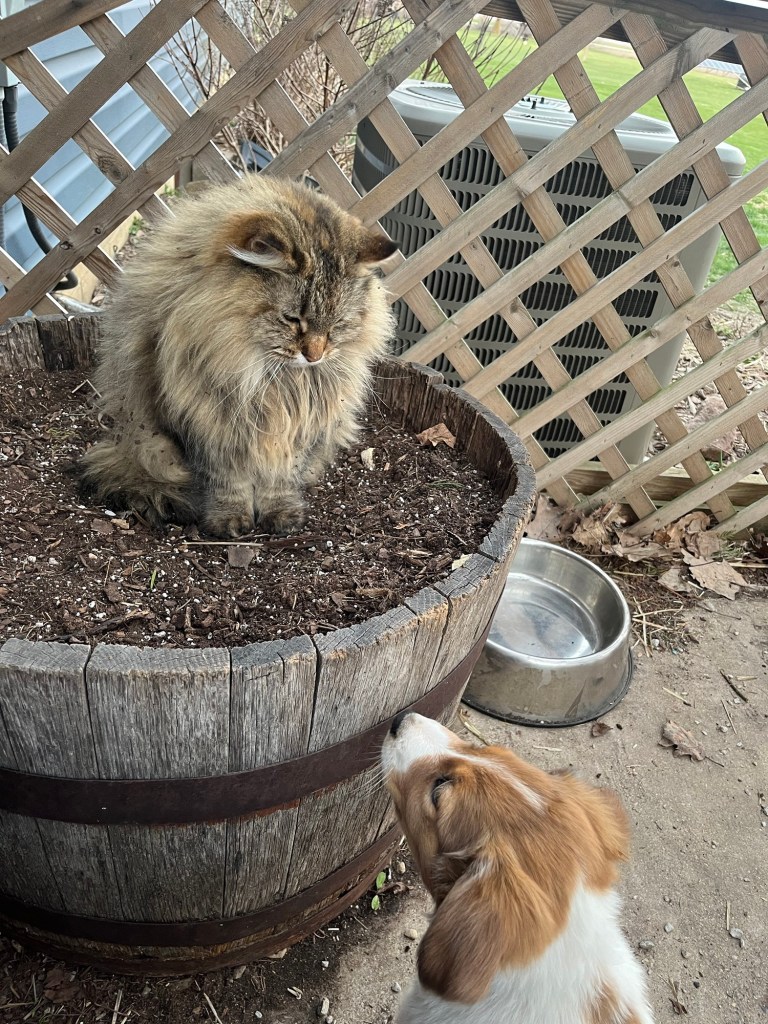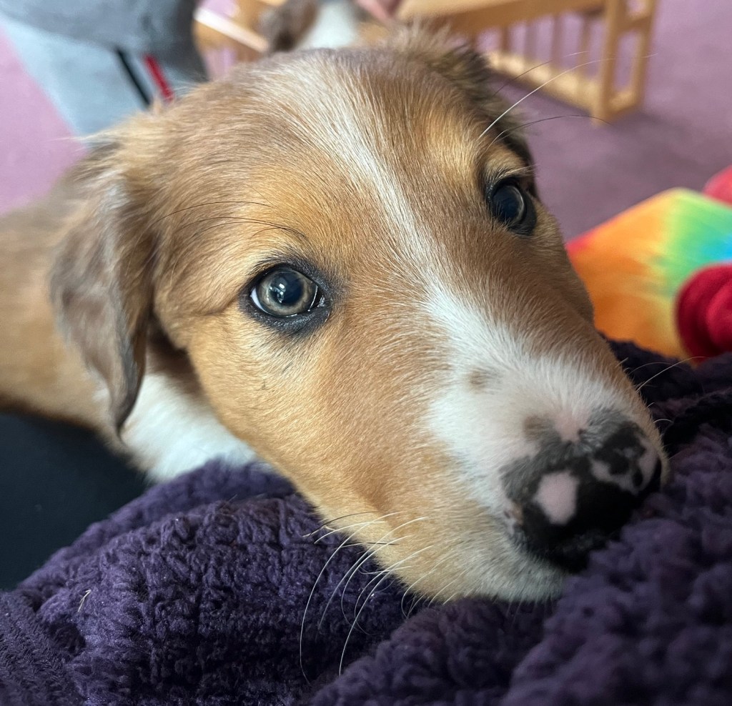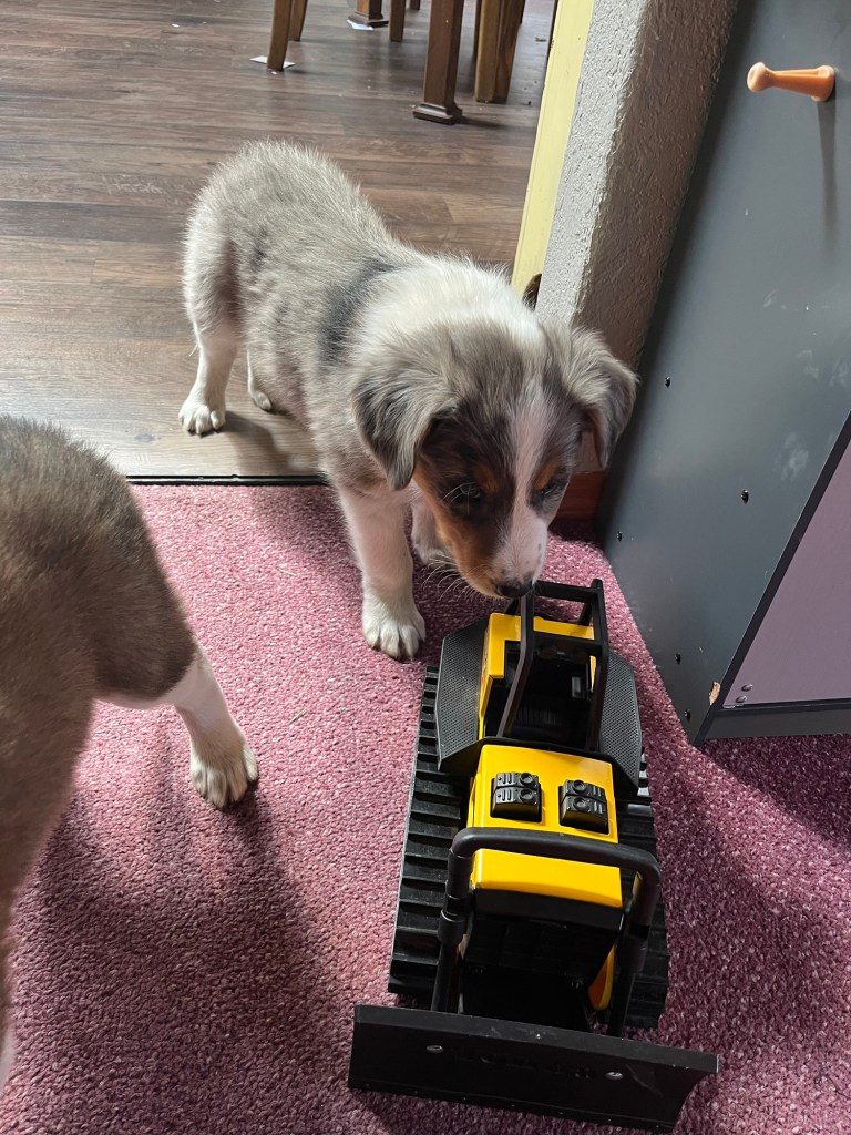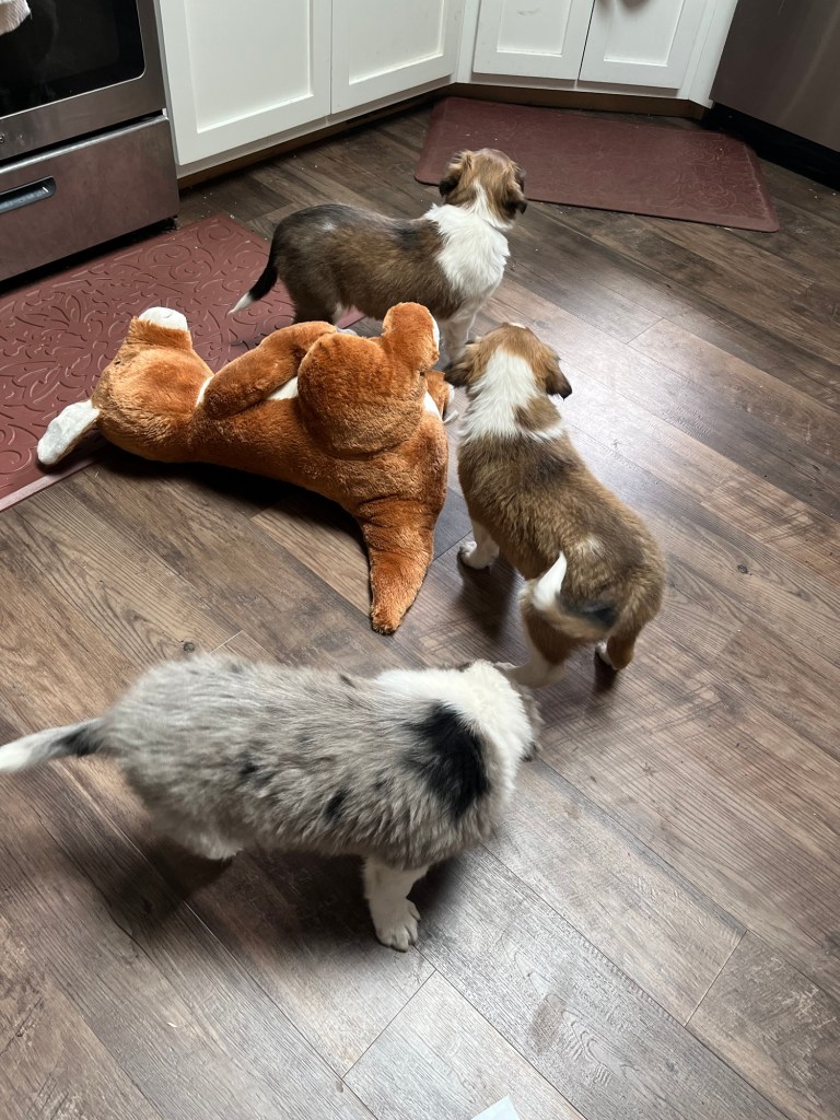 The puppies are 7 weeks old! We have been introducing them to new sounds and experiences. They are weaned now, mostly it seems. I wormed them last week (6 wks) and plan to do so again at 8 wks. They’ll have a vet visit soon too.