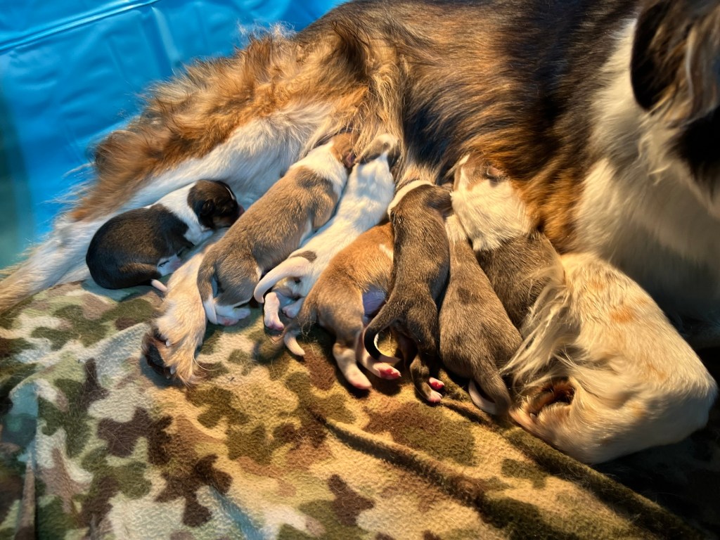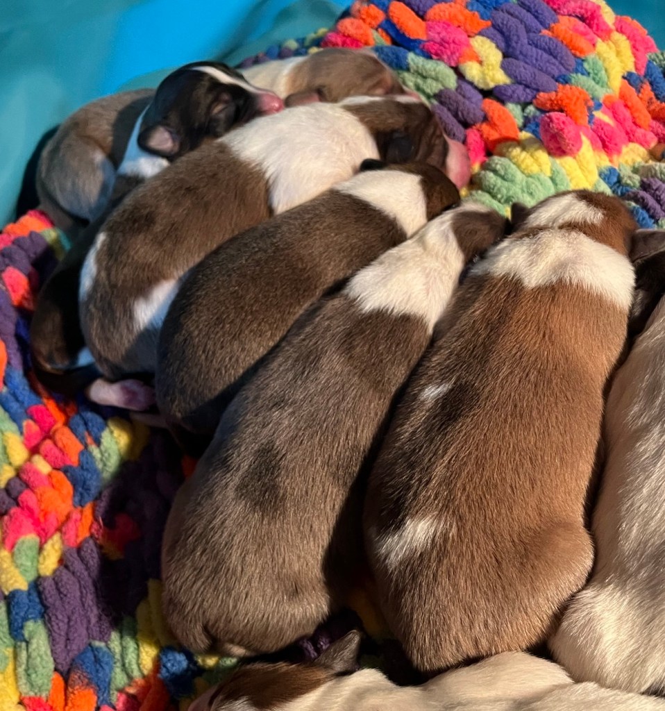 CeCe delivered a healthy litter March 1, 2025. There are 5 males and 3 females in a variety of colors!