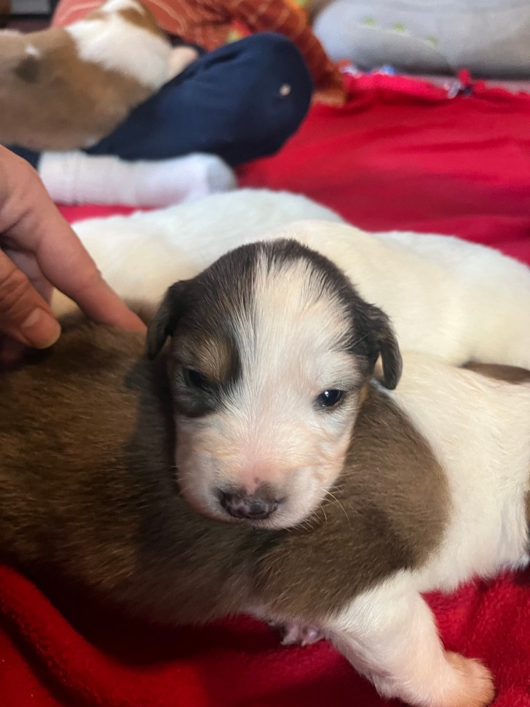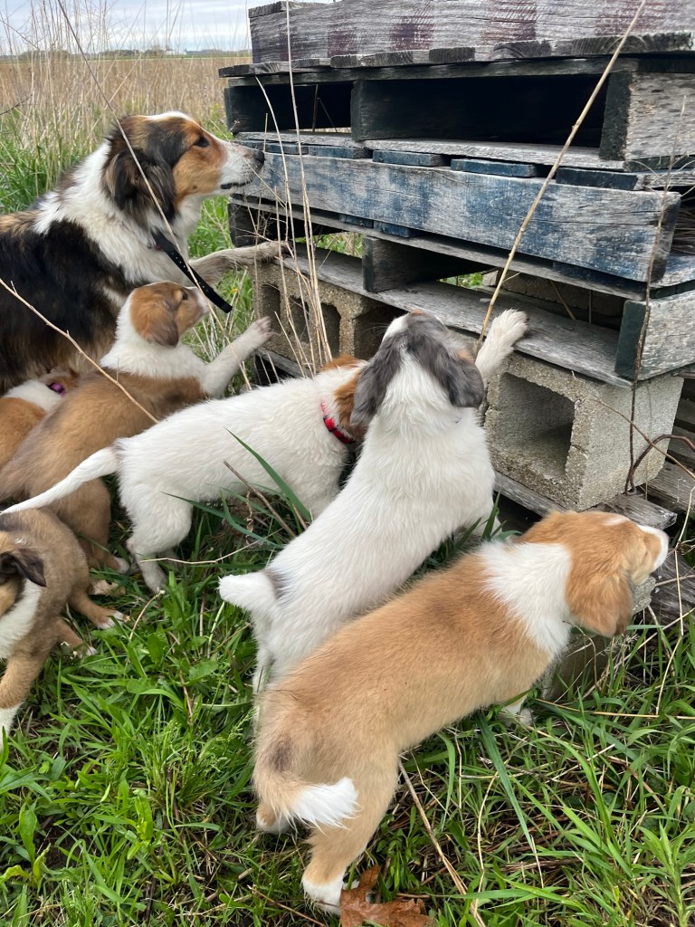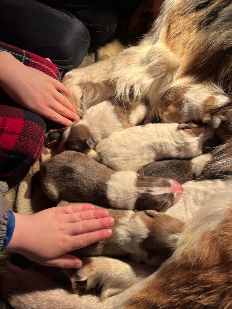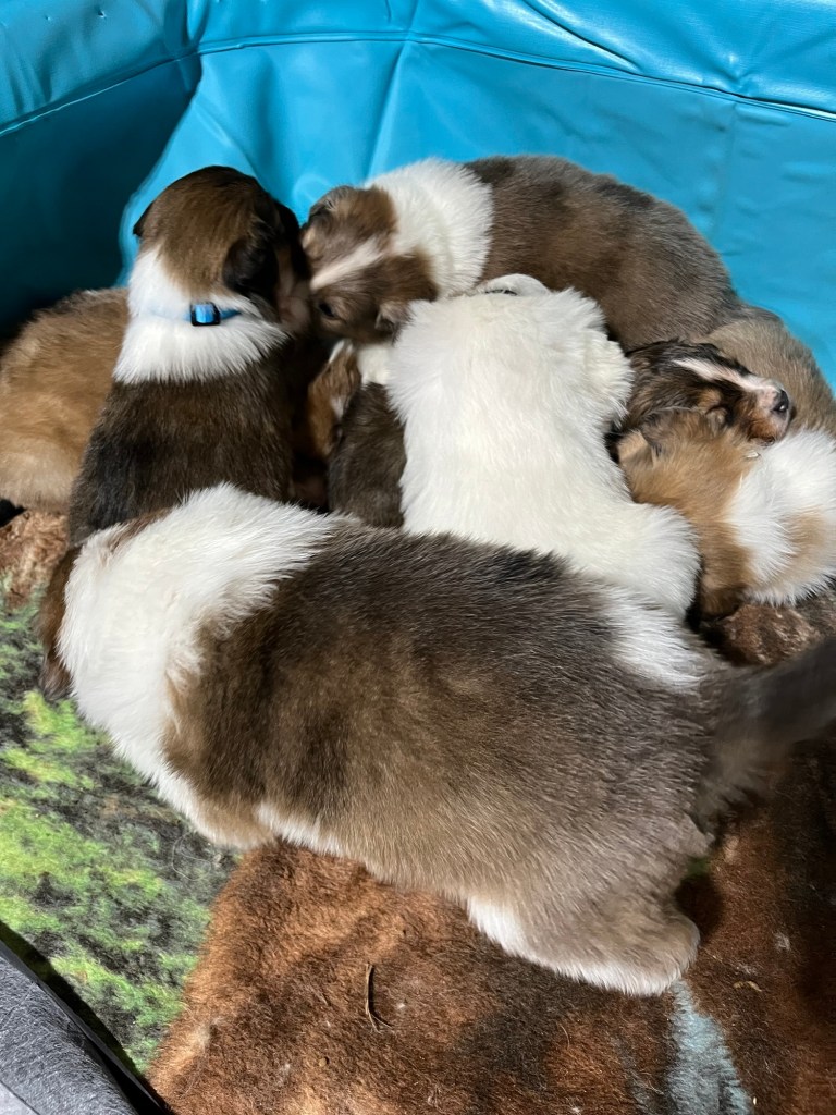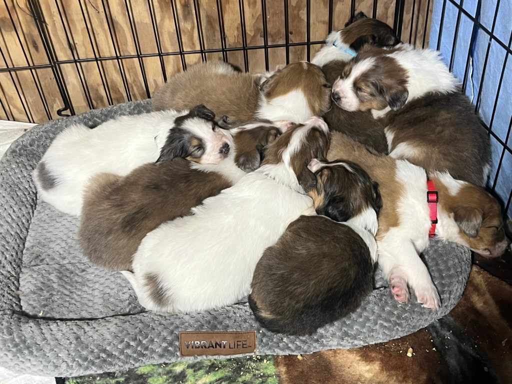There are 2 sable merles, 2 mostly white with masking and a spot or two, 2 dark sable and white, 1 blue merle, and 1 which may be a sable merle or merle! The merle is strong in this litter. 😊