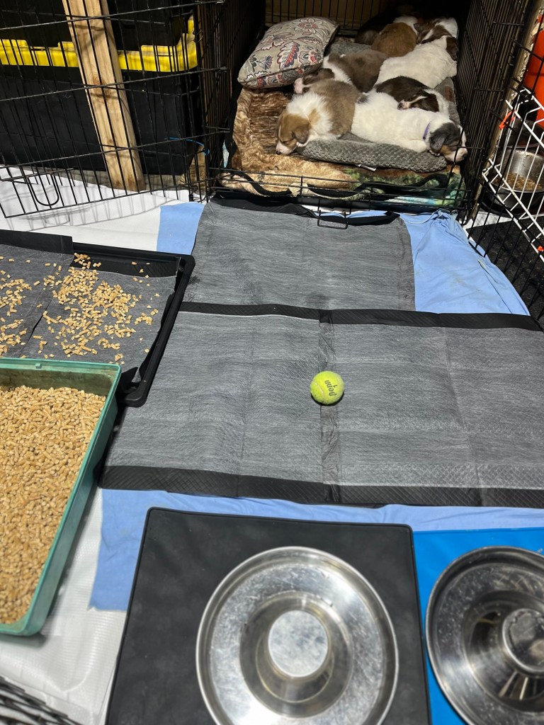 With the warmer weather, the pups have been spending time during the day in our outside kennel later this week. Lastly, I redid their pen to start litter training!